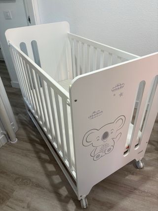 Vendemos conjunto de cuna y cambiador prácticamente nuevo , La cuna es regulable en altura y el lateral se baja para poder acceder mejor a la hora de tumbar al bebé .( Incluye colchón de fibra de coco , colcha+ chichonera y juego de sábanas los de la foto ) El cambiador incorpora bañera y estantería lateral para accesorios de baño. Prácticamente nuevo , el uso de un bebé Precio 360€ completo Zona Pau de Móstoles , cerca del antiguo enjoy