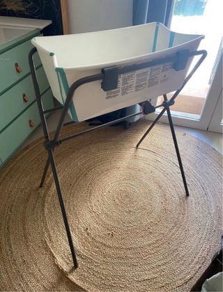 Bañera para bebé de la marca Stokke. Incluye patas plegables, bañera y soporte para el bebé. Nota: la pestaña para cerrar la bañera está rota y las patas tienen un pelín de oxido en la unión. Ninguno afecta a su funcionalidad pero prefiero indicarlo. Ver fotos.