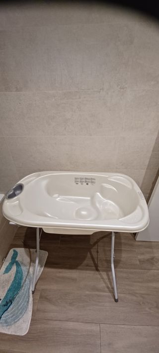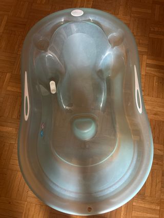 Bañera plegable para bebé, ideal para ahorrar espacio. Incluye termómetro para controlar la temperatura del agua, aunque las últimas veces no funcionaba. Está en muy buen estado, apenas usada. - Bañera plegable de plástico resistente. - Diseño ligero y fácil de guardar. - Incluye soporte para recién nacidos.