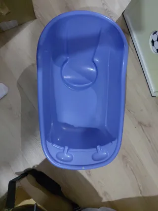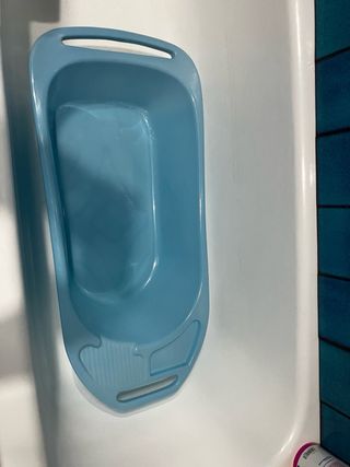 Bañera de plástico azul para bebés, con un diseño ergonómico para mayor comodidad Barras para adaptar a la bañera y asi sea mas comodo para bañar al bebé . En buen estado tiene material anti deslizamiento para la zona de la espalda cabeza para que no resbale el bebe recién nacido se mantiene fijo mientras disfruta del baño y cuando ya es más grandecito tiene la bañera para que se mantenga bien sentado sin riesgo a caerse Una buena ayuda para cuidar la espalda de la madre se agradece la comodidad no tiene precio. Tiene su tapa para ponerle, en su baño relajante luego se destapa para que se vaya el agua del javon.