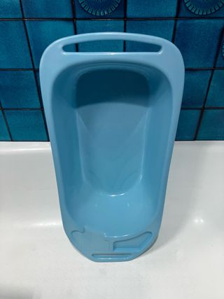 Bañera para bebé, en color azul celeste. Está en buen estado. - Ideal para bañar a bebés de forma cómoda y segura. - Fabricada en plástico resistente y ligero. - Diseño ergonómico con reposacabezas integrado. - Incluye dos prácticos espacios para colocar jabón u otros artículos de baño.