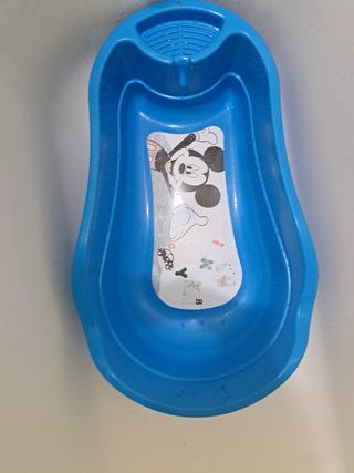 Bañera de plástico azul para bebés, con diseño de Mickey Mouse. - Material: Plástico resistente. - Color: Azul. - Diseño: Estampado de Mickey Mouse en el interior.