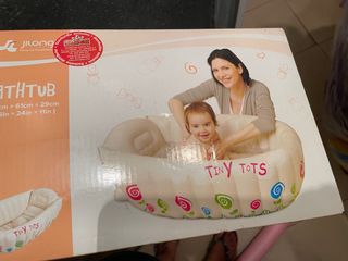 Bañera inflable para bebé de la marca Tiny Tots, en buenas condiciones. Es perfecta para bañar a los más pequeños de forma cómoda y segura. - Medidas: 91cm x 61cm x 29cm (36in x 24in x 11in) - Diseño alegre y colorido con motivos infantiles. - Hinchable y fácil de guardar. Usada una sola vez.