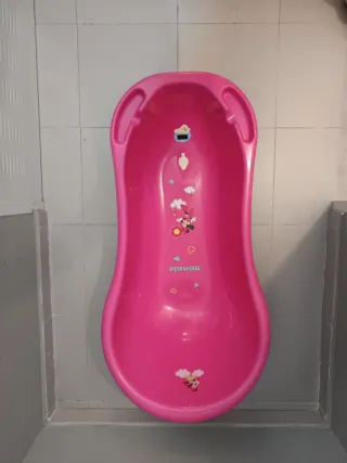 Bañera de plástico rosa para bebés con diseño de Minnie Mouse. Ideal para los primeros baños. - Color rosa vibrante. - Adornos de Minnie Mouse y corazones. - Forma ergonómica para mayor comodidad.