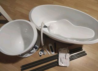 Bañera para bebé de la marca Luma, color blanco y gris claro. Incluye: tapón, hamaca adaptadora para los primeros meses, tubo de desagüe, cubo para desagüe con tapa. Antiguedad: 2022. Precio original 140€.