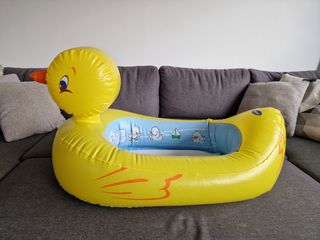 Bañera inflable con forma de pato, ideal para el baño del bebé. Su diseño divertido lo hace más entretenido. - Material inflable. - Diseño de pato amarillo. - Ilustraciones interiores de patitos y barcos.