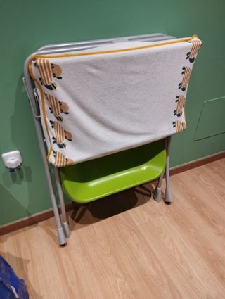 Práctica bañera y cambiador para bebés, ideal para ahorrar espacio. Su diseño plegable facilita su almacenamiento. La bañera no tengo fotos porque la tengo en el trastero, pero incluye gomita para el vaciado. El cambiador no lo usé porque tenía otro, osea que estaría a estrenar prácticamente. - Estructura metálica. - Bandeja inferior con rejilla para dejar toallas, accesorios de baño... - Cambiador acolchado con estampado de estrellas. - precio original 129€