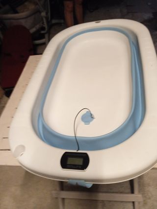 Con patas/soporte. También adaptador RN. Báscula: memoria almacena el peso anterior, por lo que puedes mantener un seguimiento. El termómetro de agua muestra continuamente la temperatura; Mi experiencia ha sido muy buena, es super segura para bebés y cómoda para los padres. Si lo vienes a recoger lo dejo por 35 euros.