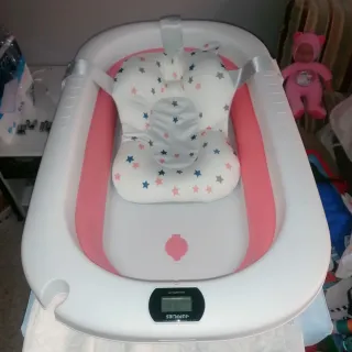 Bañera plegable para bebés, diseñada para hacer el baño más cómodo y seguro. Incluye un cojín suave con estrellas y una báscula digital integrada para controlar el peso del bebé. - Diseño plegable para fácil almacenamiento. - Cojín de estrellas para mayor comodidad. - Báscula digital integrada.
