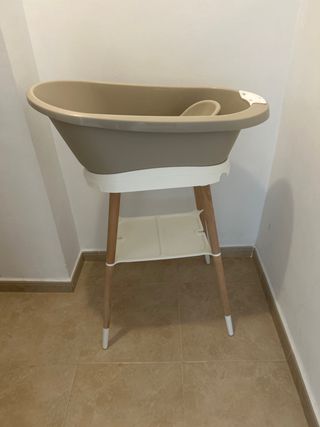 Bañera para bebé en color beige con soporte. - Diseño ergonómico. - Soporte de madera y plástico blanco. - Bandeja inferior para accesorios.