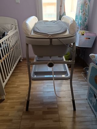 Cambiador con bañera de la marca Jané, en buen estado. - Estructura de metal resistente. - Incluye bañera extraíble de plástico. - Dos bandejas para almacenar productos de higiene. - Superficie acolchada para cambiar al bebé.
