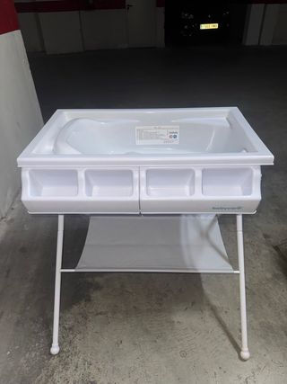Bañera y cambiador para bebés, ideal para el cuidado diario. - Incluye cambiador acolchado. - Funda de cambiador. - Bandeja inferior para accesorios. - Estructura plegable y estable. Buen estado, mancha en la goma que no se quita de estar guardado.