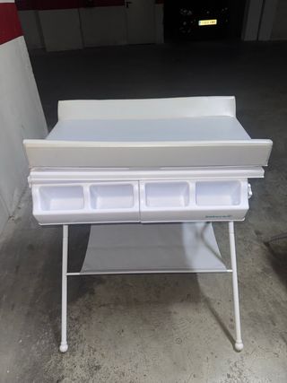 Cambiador de bebé con mucho espacio en la bandeja de abajo para colocar cosas. Lleva incorporado una bañera con su tubo para poder vaciarla directamente. La funda que envuelve la almohadilla donde se cambia el niño está algo rota por una esquina( se ve en la foto), pero se cambia fácilmente y no es cara. Por lo demás está en perfecto estado