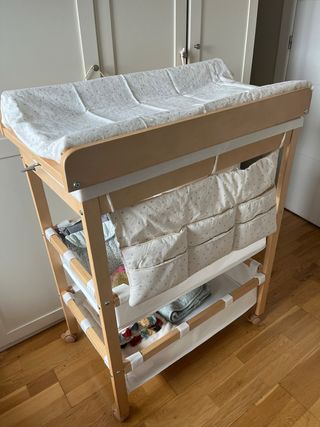Elegante mueble bañera-cambiador de madera, perfecto para la habitación del bebé. Su diseño combina funcionalidad y estilo. - Estructura de madera clara. - Incluye cambiador acolchado. - Dispone de varios compartimentos de almacenaje. - Ruedas para facilitar su movilidad.