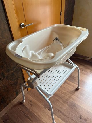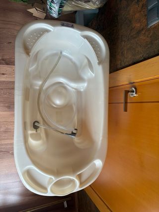 Bañera de plástico para bebé con soporte. Es muy comoda y práctica, la usamos mucho también de cambiador en el baño! Tiene abajo la bandeja para poner todo, pañales, jabones... - Color blanco roto. - Incluye manguera de desagüe. - Soporte plegable para facilitar su almacenamiento. Tiene una pequeña raja en un lado, pero con una funda queda perfecta. La manguera esta un poco usada, estará para cambiarla, pero la dejo para la medida