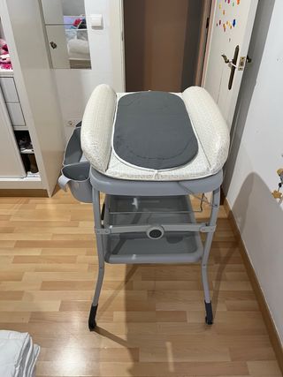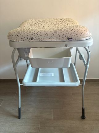 Cambiador y bañera para bebé de la marca Chicco. Ideal para el cuidado diario del recién nacido. - Incluye cambiador acolchado. - Bañera integrada. - Estructura plegable para fácil almacenamiento.