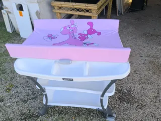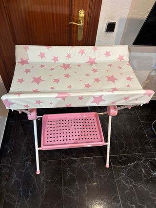 Preciosa cambiador bañera para bebé de la marca Plastymir. Está en buen estado y es ideal para facilitar el cuidado del bebé. En una esquina de la España está rota como se ve en la foto. Yo la tenía puesta con funda, como se ve en otras fotos con funda roda y otra funda de estrellas. Tengo las fundas también, aunque usadas más desgastadas. Tiene la goma del agua de la bañera - Incluye cambiador con estampado de estrellas. - Dispone de una bañera integrada. - Cuenta con una bandeja inferior para colocar artículos de aseo. - Estructura de metal con patas resistentes.
