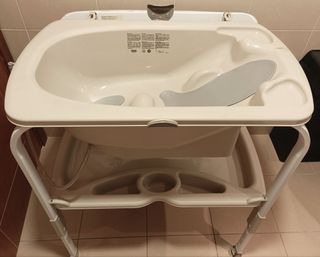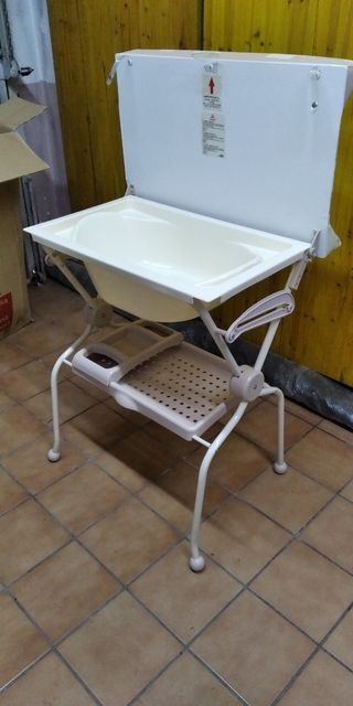 Bañera para bebé con soporte. - Incluye cambiador acolchado. - Bandeja inferior para accesorios. - Estructura plegable. su precio original son 129 euros prácticamente sin uso
