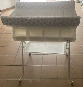 Bañera y cambiador para bebé en excelente estado, prácticamente sin uso. - Estructura blanca y acolchado con estrellas grises y amarillas. - Bandeja inferior con compartimentos para organizar. - Plegable para facilitar su almacenamiento.