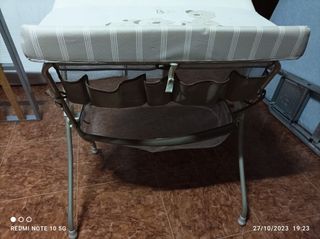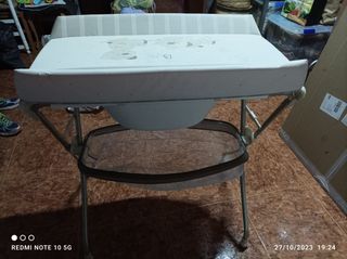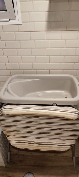 Esta como nuevo. Poco uso. Es plegable. Lleva tubo de desagüe. También lleva una canastilla abajo como se puede apreciar en las fotos para poner lo que se desee como almacenaje de productos del bebé.