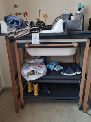 sirve de bañera, de mueble para guardar útiles y tb de cambiador con espuma. bandejas extraibles