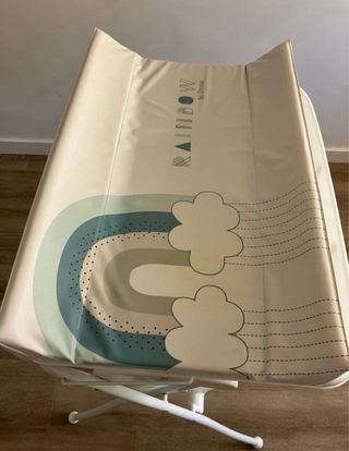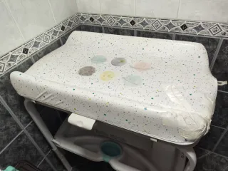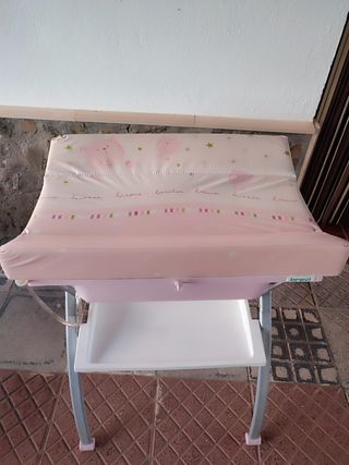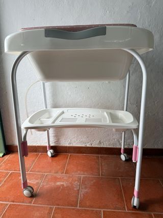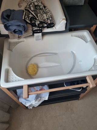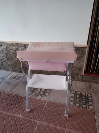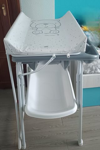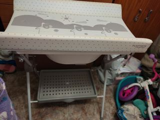 Cambiador de bebé con bañera integrada, marca Mi cuna. Bañerita recien comprada. Sirve para ponerlo sobre el baño al tener espacio abajo. Algun esconchoncillo tiene pero no se nota y se pinta facil. Tengo un recambio en rosa que fue echo a mano por mi.