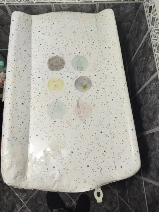 Bañera rígida con cambiador abatible.Se pliega,ocupando muy poco espacio. Está como nueva,solo tiene en los laterales una mancha amarilla que le ha salido de estar guardada,que parece que es del propio cambiador como si se transparentara.Quitando eso está prácticamente nueva,sin arañar,la esponja nueva, tiene poco uso,siempre ha tenido protector el cambiador.Tiene desagüe,con su tubo.Es de la marca plastimyr.Su precio original fue 99€.