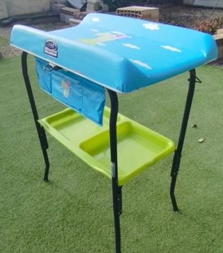 Cambiador de bebé con mucho espacio en la bandeja de abajo para colocar cosas. Lleva incorporado una bañera con su tubo para poder vaciarla directamente. La funda que envuelve la almohadilla donde se cambia el niño está algo rota por una esquina( se ve en la foto), pero se cambia fácilmente y no es cara. Por lo demás está en perfecto estado