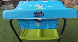 Cambiador con posibilidad de bañera Jané para bebé. Muy bien cuidado (salvo pequeña grieta en un lateral que no afecta a su funcionamiento y se puede observar en la foto). Plegable, con bolsillos y bandeja guarda pañales, jabón, etc Medidas Anchura: 80 cm Altura: 90 cm Profundidad: 46 cm