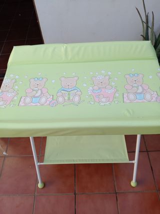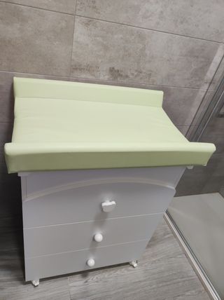 Cambiador de bebe con bañera incluida y zona de abajo para organizar pañales, toallitas, zona donde poner botes de cremas, pomadas, agua, jabón, peines, cepillos, toallas, termómetro... es muy completa tiene ruedas para poder moverla en caso de querer ponerla en alguna estancia diferente, pero no hace falta porque para bañar al bebe tiene un tubito para desaguar y nosotros poníamos un barreño al final.