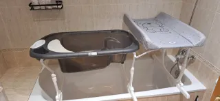 Bañera con cambiador incluido, bandeja debajo para poner productos. Se ha usado pocas veces y está en perfectas condiciones, con la caja incluida. Hamaca en buen estado. ¡Precio negociable. Se venden por separado también.