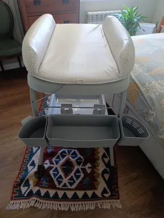 Cómoda de cajones con hueco para cambiador y bañera para bebé. Nosotros lo hemos usado sólo como cambiador y armario pero se puede meter una bañera. La gomaespuma del cambiador la hemos tirado. Tiene algunos arañazos en la parte de arriba (donde estaba pegado el cambiador) y algún cajón abre mal.