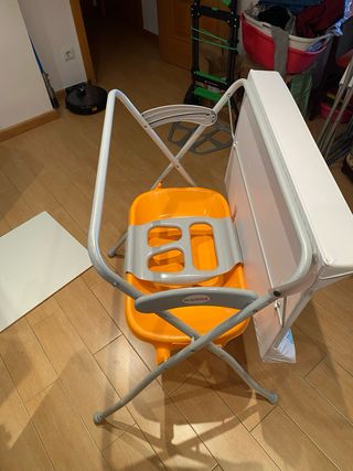Cambiador súper ligero y plegable perfecto para encima de bidé. Plastico cubierto con cinta textil negra para evitar que se rajara mas. Se incluye bañera en perfecto estado solo las gomas con visible desgaste del color por los aceites ver ultima foto. Totalmente desinfectada y limpia incluido el tubo de desagüe.