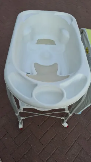Bañera con cambiador. El cambiador es mullido con estampado, está el perfectas condiciones. Bañera con posición ergonómica y antideslizante, dos posiciones de 0-6 meses y 6-12 meses. Se puede poner en dos direcciones para diestros y zurdos. Gran bandeja deshacerme con cuenco para dejar caer el agua al bebé. Se puede plegar y es ligera.