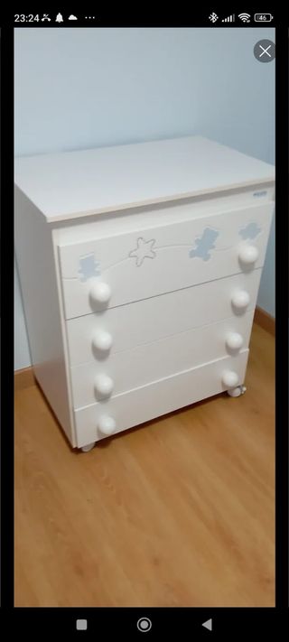 Se vende cómoda- cambiador y armario infantil: - Comoda blanca swarovsky- cambiador con bañera integrada. Tiene una cenefa color azul con los cristales svarosky. Y contiene tres cajones mas. Se encuentra en estado nuevo. Mide 85 centímetros de alto y 77 centímetros de ancho. Para cualquier consulta no duden en ponerse en contacto conmigo.
