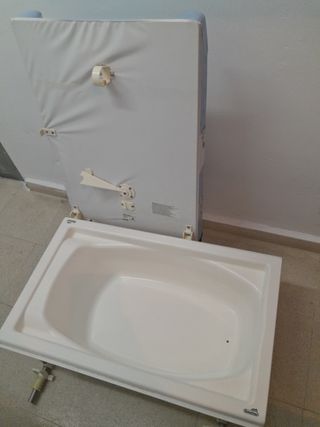 Bañera para bebé muy útil para poner encima de bañera normal. Con cambiador un poco estropeado del uso pero por ello regalo funda de piqué que puede ser utilizado para ello