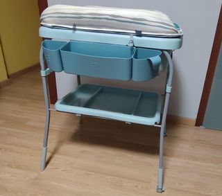 Preciosa bañera cambiador de Chicco, en perfecto estado. Es muy práctica y cómoda para el baño y el cambio del bebé. - Incluye bañera extraíble. - Dispone de cambiador acolchado. - Tiene varios compartimentos para guardar productos de higiene. - Estructura de metal resistente y ligera.