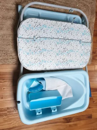 Práctica bañera y cambiador para bebés. Se ha usado, está en buenas condiciones salvo los dos enganches del cambiador que tiene. daños estéticos, ver últimas fotos. - Diseño ergonómico para mayor comodidad. - Incluye compartimentos para organizar. - Estructura plegable para fácil almacenamiento.