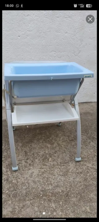 Es una bañera muy práctica ya que es alta y en cuanto terminas de bañarlo puedes poner el cambiador encima y vestir tranquilamente al bebé. Tiene un tubito que se pone o se quita para poder quitar el agua muy fácilmente y que caiga al lavado por ejemplo. En perfecto estado. Se usó unos 2 meses y lo tenemos envasado y muy bien cuidado.