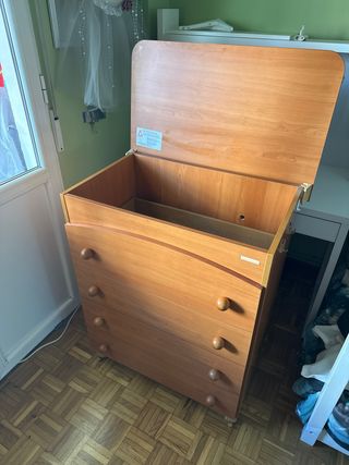 Cómoda cambiador Micuna en madera color miel, con ruedas, facil de mover , con espacio para bañera. Está en buen estado. - Cuatro cajones amplios. - Estructura robusta y estable. - Perfecta para organizar la ropa del bebé. - NO Incluye bañera. -Tiene seguro en la tapa de arriba.