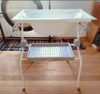 Vendo bañera cambiador para bebé, en buen estado. - Incluye bañera y cambiador. - Estructura de metal. - Color beige claro.