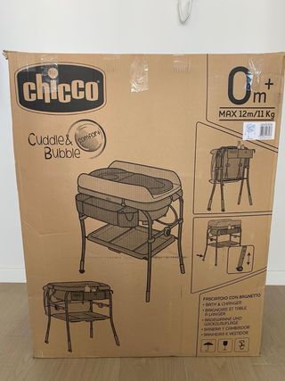 Bañera y cambiador Chicco Cuddle&Bubble en buen estado. Práctica y funcional para el cuidado del bebé. - Diseño compacto y ergonómico. - Incluye compartimentos para organizar. - Patas estables para mayor seguridad.