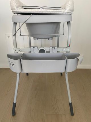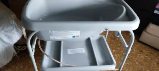 Bañera y cambiador de la marca Chicco en color gris. Un práctico artículo para el cuidado del bebé. - Diseño compacto y funcional. - Incluye cubeta. - Bandeja inferior para accesorios. En nuevo estado, usado unas cuantas veces, ocupa mucho espacio en nuestra habitación, se vende con su caja