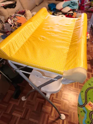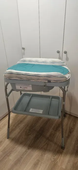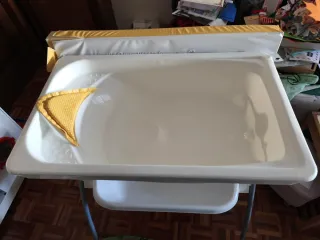 Cambiador con bañera integrado. marca Chicco. Se encuentra en perfecto estado a excepción de un pequeño roto donde el botón visible en la última foto. (lo he visto al ir a hacer las fotos para el anuncio) - Diseño funcional y práctico. - Estructura resistente y estable. - Es plegable. - Bandeja inferior para almacenamiento, también bandeja saliente lateral que se puede quitar o poner para un mayor almacenamiento. A recoger en Leganés.