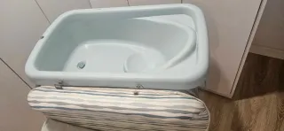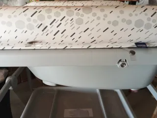 Bañera cambiador de la marca Chicco, ideal para el cuidado del bebé. - Estructura resistente y estable. - Bandeja organizadora lateral. - Cambiador acolchado incluido. - Incluye adaptador para bebe pequeño -Incluye dos fundas adaptables de Ikea En plástico tiene roturas del uso que no interfieren en el uso y el tubo de desagüe está sucio, pero no influye en el bebé.