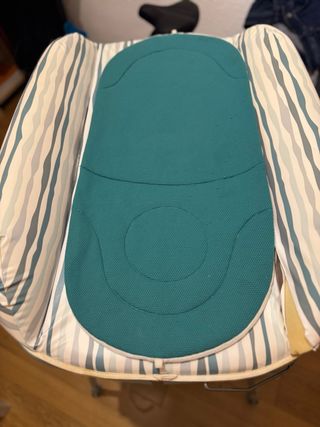 Bañera cambiador de la marca Chicco. Cuenta con una colchoneta acolchada y varios compartimentos para organizar los productos del bebé. - Colchoneta con estampado de gotas. - Bandeja inferior. - Compartimentos laterales. Tiene un pequeño descosido.