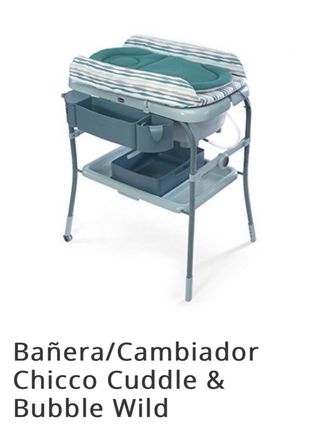 Cambiador y bañera para bebés de la marca Chicco, modelo Cuddle & Bubble. - Incluye cambiador acolchado. - Bañera integrada. - Estructura plegable para fácil almacenamiento. Puedo enseñar fotos del estado real, ahora está empaquetado.