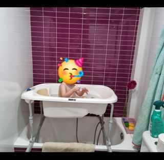 Bañera acoplable. Esta bañera se acopla a la bañera de casa con las 2 patas. Es de lo más cómodo que he podido tener. La he usado hasta los 3 años. Tiene vaciado, zona freno para que el bebe no caiga y area para reposar y tumbarse. Huecos para el jabón y accesorios. MUY ÚTIL y cómoda sobretodo porque mantienes espalda recta mientras bañas al bebé.