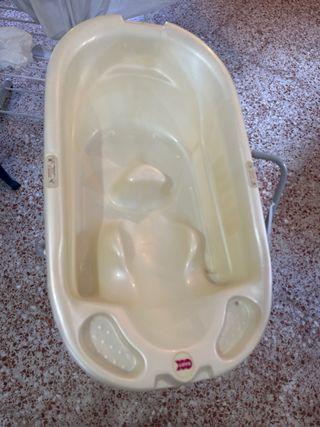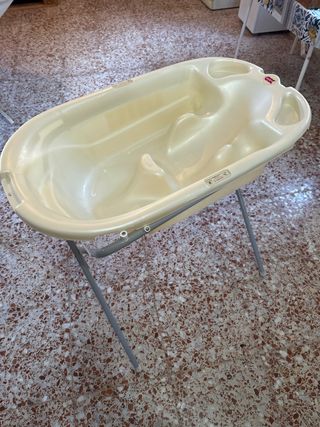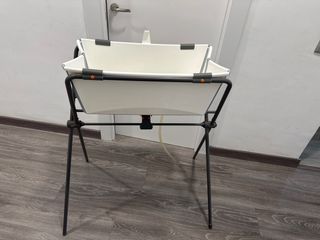 Bañera Stokke con patas plegables y soporte para bebes, ideal para el baño del bebé. - Patas plegables para fácil almacenamiento. - Diseño ergonómico. - Tapón con indicador de temperatura y tapón con manguera. - La manguera esta un poco picada del tiempo. se puede cambiar por otro tubo o poner cintas aislante. - En la junta de las patas presenta un poco de oxido, que una vez montado queda en el interior.