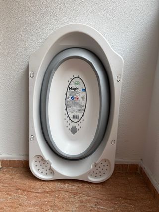 Bañera plegable para bebe - Diseño plegable para fácil almacenamiento. - Patas de soporte para mayor estabilidad. Incluye un tobogán para tumbar al bebe con ventosas que encaja perfectamente en la bañera. Todo como nuevo, la vendo porque nos han regalado otra.